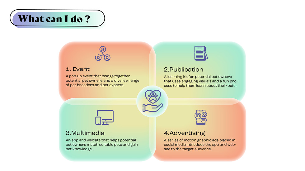 Publications: A playful learning kit to help viewers learn about pets. Multimedia: An app and website that helps potential pet owners match suitable pets and learn about pets.Advertising: A way to find more potential users to help them live a better life with their